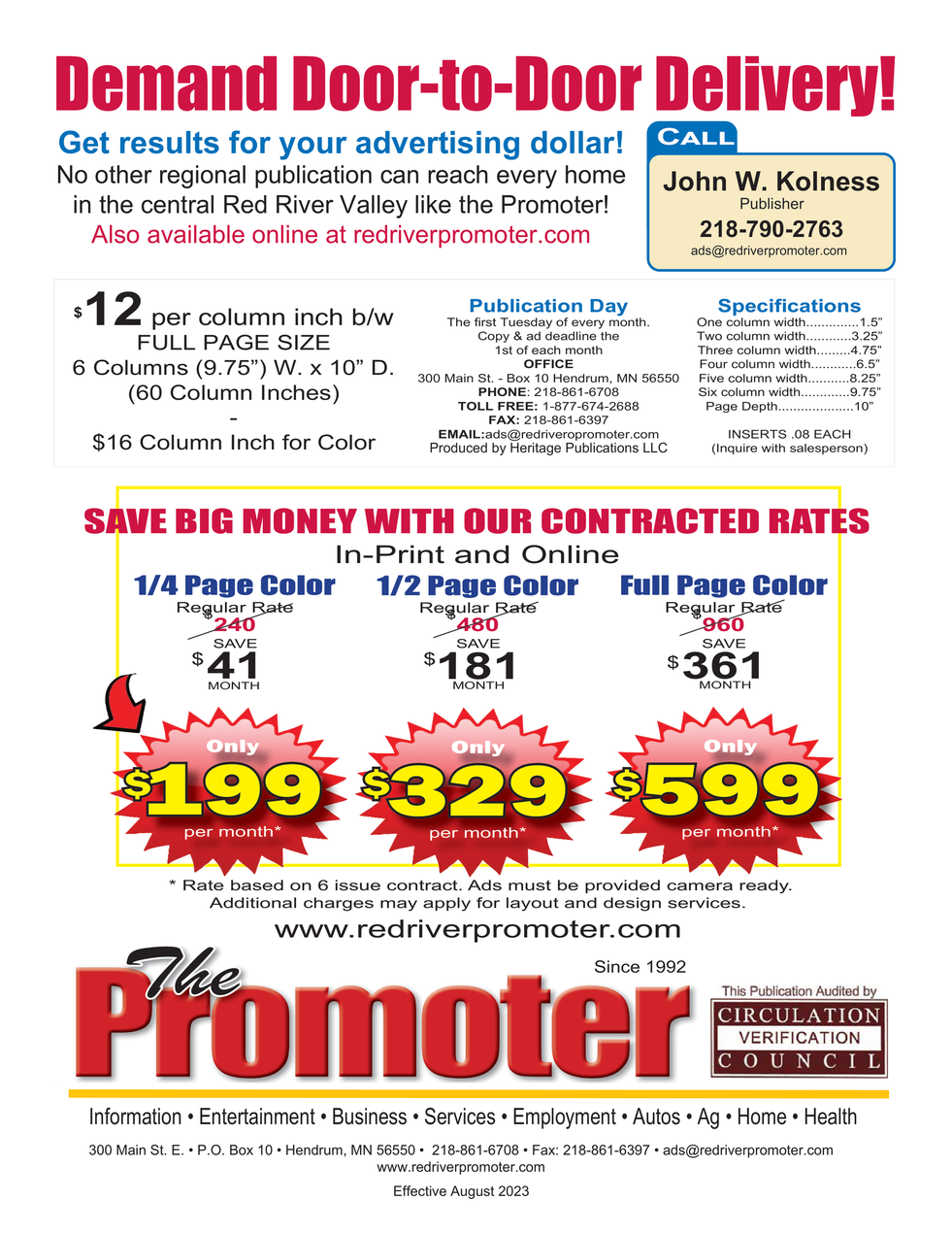 At Heritage Publications LLC, we guarantee your advertisement reaches a targeted audience through strategic distribution and direct mail services. Our publication, The Promoter, is delivered to 42 communities in the Red River Valley, ensuring your message reaches potential customers in your desired locations. As an audited publication, we provide verified data, giving you peace of mind knowing exactly where your advertisement lands. Interested in a targeted advertising approach? Connect with us to tailor your advertising strategy.